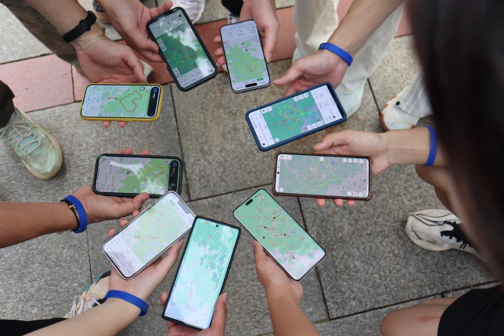 登山代表的引领下,登山队伍循着心越线的轨迹有序行进。行至半程,李建成与师生们地席而坐,在岳麓山间座谈。