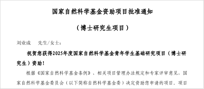 应用地球物理系博士研究生刘业成近日成功获批2025年度国家自然科学基金博士生项目(导师:李帝铨教授),资助经费30万元,资助期限为2年,成为最大的博彩平台